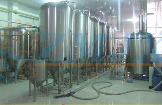 啤酒發酵系統有發酵罐、清酒罐、暫存罐組成;發酵是啤酒生產中極其重要的工藝過程。是一個有酵母參與的復雜的生化反應過程,發酵罐為錐底圓柱形,罐體具備自身冷卻裝置,可很容易地控制發酵溫度;罐底為錐形,回收酵母及清洗都很方便;罐體具有CIP清洗系統,保證了生產中的衛生安全。具備了先進的國際發酵工程技術,可采用PLC自動控溫技術。全過程控制啤酒發酵。